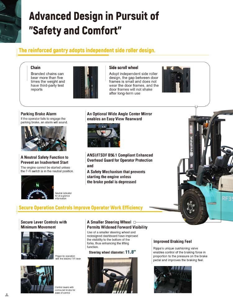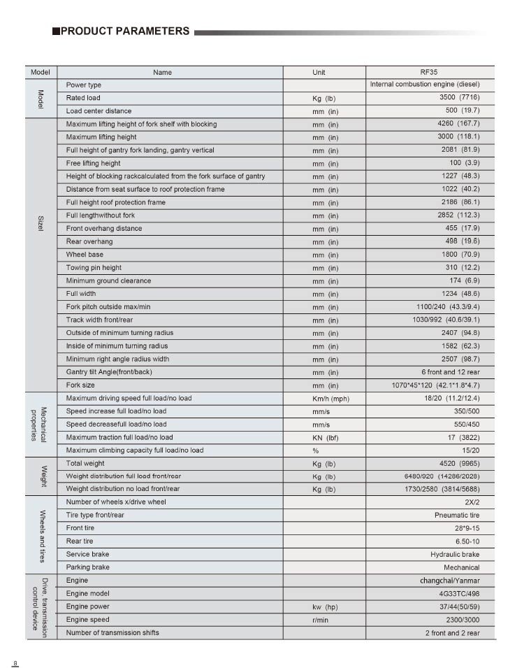 The RF35 diesel forklift has high performance and reliability, and is equipped with rearview mirrors, working headlights, thickened door frames, etc. to improve safety and practicality. The stable structure ensures the stability and safety of the forklift under heavy loads. With its excellent performance and reliability, the RF35 diesel forklift is suitable for logistics, warehousing, manufacturing and other fields.