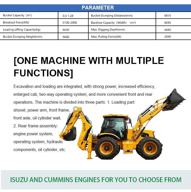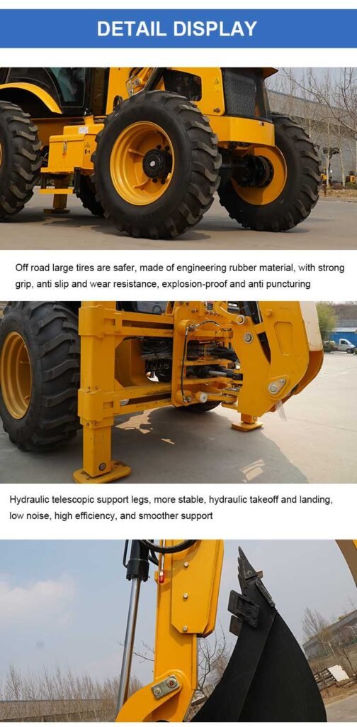 The backhoe is a multi-functional engineering machine that can not only dig and carry, but also level the ground. The backhoe excavator adopts four-wheel drive hydraulic transmission and hydraulic control system, which can realize a variety of construction operations, including excavation, loading, leveling, turning, etc.